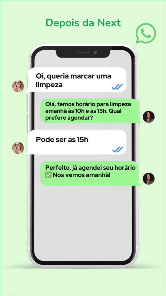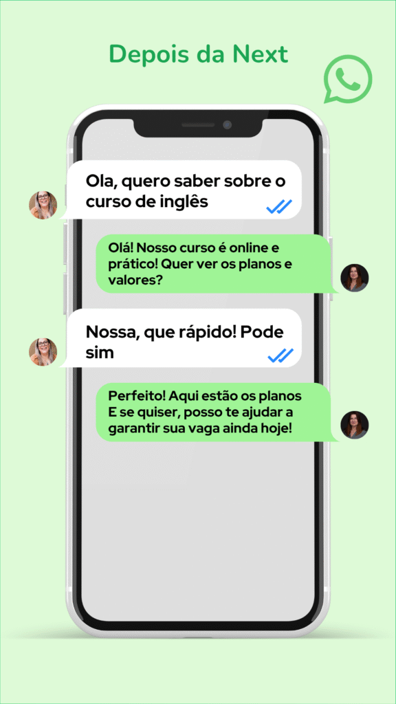 O time de especialistas da NEXT vai marcar uma reunião para entendermos o seu negócio e definirmos os seus objetivos, depois disso vamos programar e treinar a Super Agente com base no seu processo de vendas e ou atendimento, depois disso é só conectar ao seu número de WhatsApp Comercial para transformar ele em uma máquina de conversões.